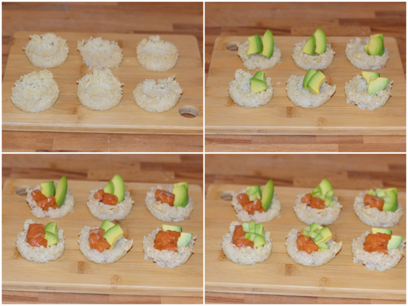 Infine assemblate: dispondete i cestini su di un piatto o vassoio e riempiteli con salmone, avocado e cetriolo.