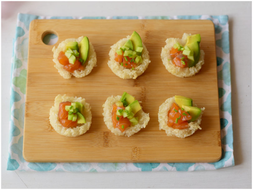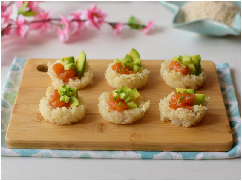 I cestini sushi sono un modo originale e sfizioso per portare in tavola il gusto del sushi in una forma inusuale. Perfetti per un aperitivo o una cena informale con amici, questi cestini combinano la croccantezza del riso cotto al forno con la freschezza del salmone, dell'avocado e del cetriolo. Prepararli è semplice e divertente, e l'effetto finale è sorprendente. Non preoccupatevi se non trovate il riso specifico per sushi: potete utilizzare del normalissimo riso a chicco corto. Un'alternativa interessante potrebbe essere sostituire il salmone con il tonno o con dei gamberi, oppure creare una versione vegana utilizzando ad esempio tofu affumicato o edamame.... Che dite, vi piace l'idea di questi cestini sushi?