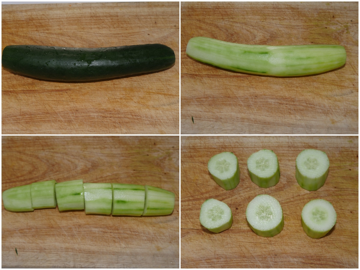 Lavate il cetriolo, pelatelo, tagliate via le estremità e tagliatelo in piccoli cilindri da circa 3 cm l'uno.