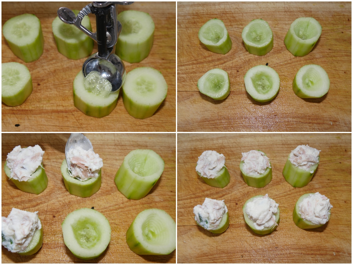 Riempite ogni ciotolina di cetriolo con un po' di riepieno.