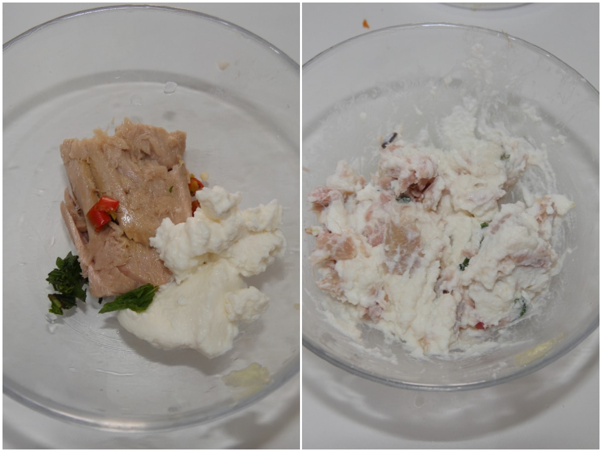 Innanzitutto lavate e tritate la menta e tagliate a pezzetti il peperoncino; metteteli in una ciotola con tonno, ricotta e un po' di sale, e mescolate.