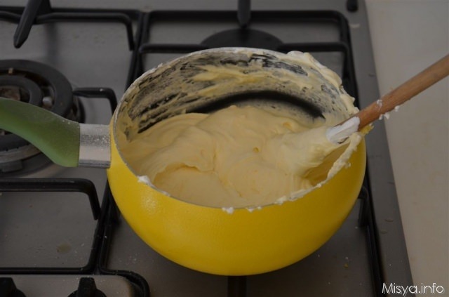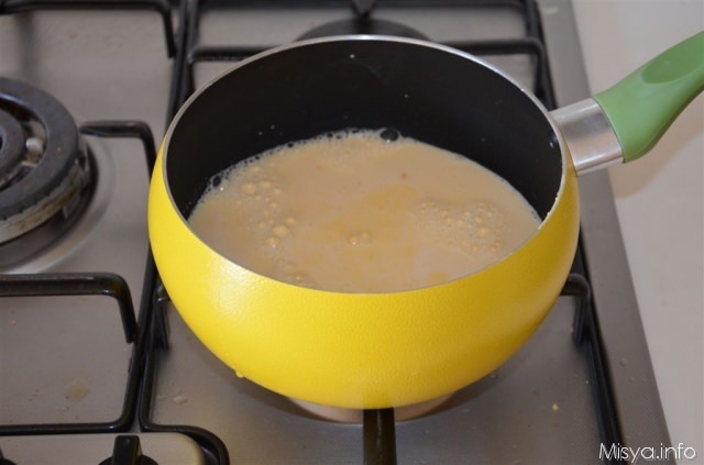 Versare il composto in un pentolino dal fondo spesso e cuocere a fiamma bassa mescolando di continuo con un cucchiaio di legno.