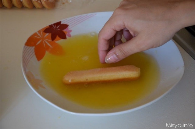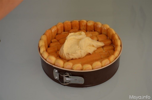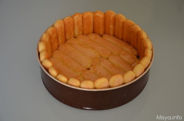 Spuntate 25 savoiardi circa per renderli alti quanto il bordo dello stampo, inzuppateli leggermente nella bagna all' arancia su un solo lato e poi disponeteli a palizzata intorno allo stampo con la parte zuccherata rivolta verso l’esterno.