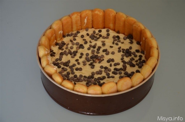 Versare ora uno strato di crema all'arancia sulla base di savoiardi, livellare il più possibile quindi ricoprire con la metà delle gocce di cioccolato.