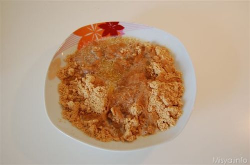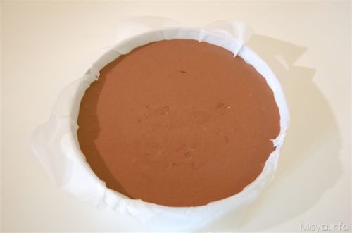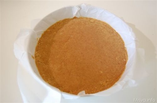 Versate il composto sulla base di una tortiera da 22 cm foderata di carta forno e livellare la base di biscotti aiutandovi con un bicchiere. Mettete quindi in frigo a far compattare per mezzora.