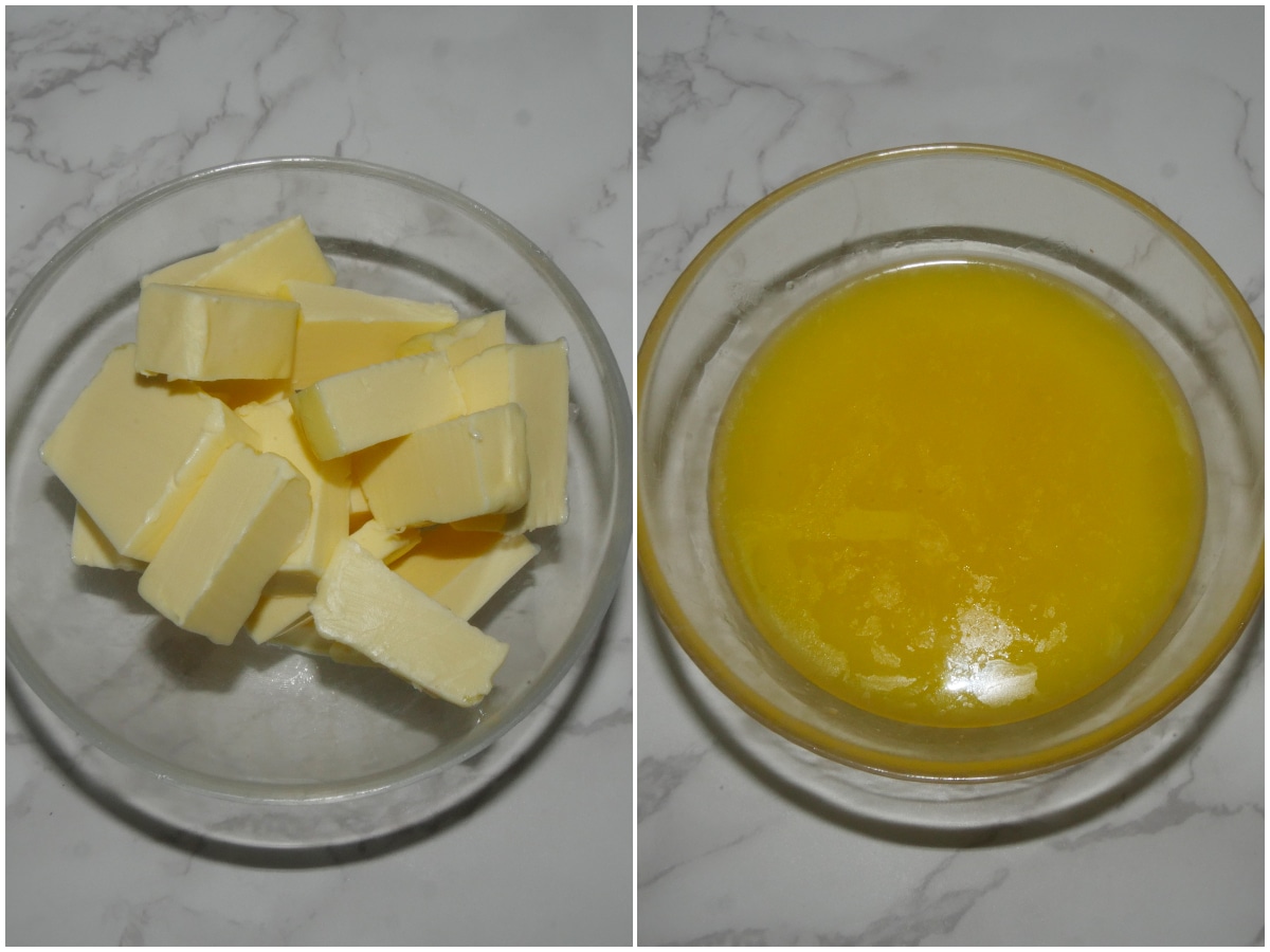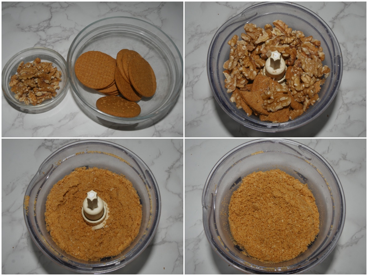 Iniziate dalla base: sciogliete il burro (in microonde o a bagnomaria) e tritate finemente i biscotti e le noci con un mixer.