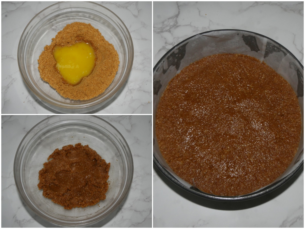 Unite burro e biscotti, amalgamate e versateli nello stampo (io l'ho rivestito di carta forno per sformare più facilmente il dolce una volta pronto), quindi compattate bene sul fondo e lasciate riposare in frigo per almeno 15 minuti.