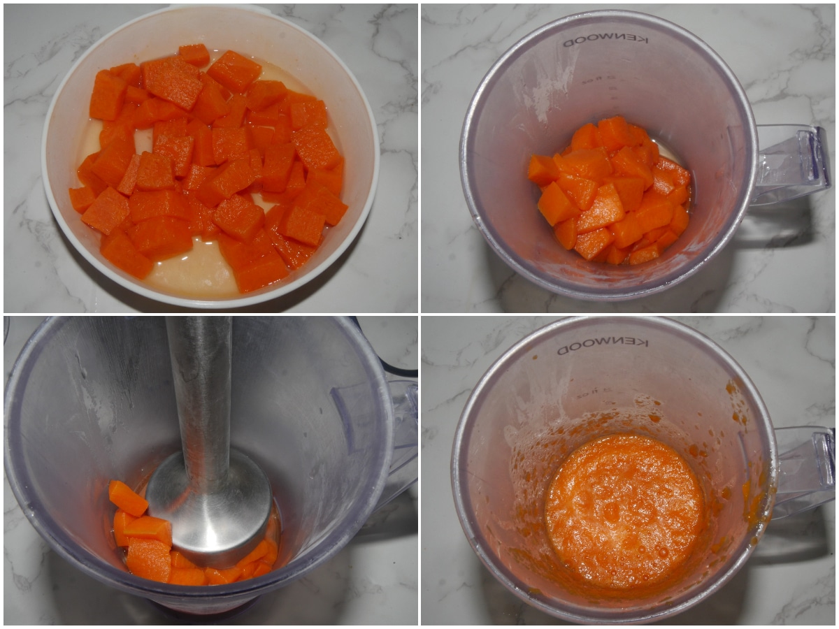 Innanzitutto, se non l'avete ancora fatto, sbucciate la zucca, tagliatela a cubetti e cuocetela per almeno 10 minuti in microonde con poca acqua (oppure per 15 minuti in un pentolino antiaderente con coperchio), quindi lasciatela raffreddare.