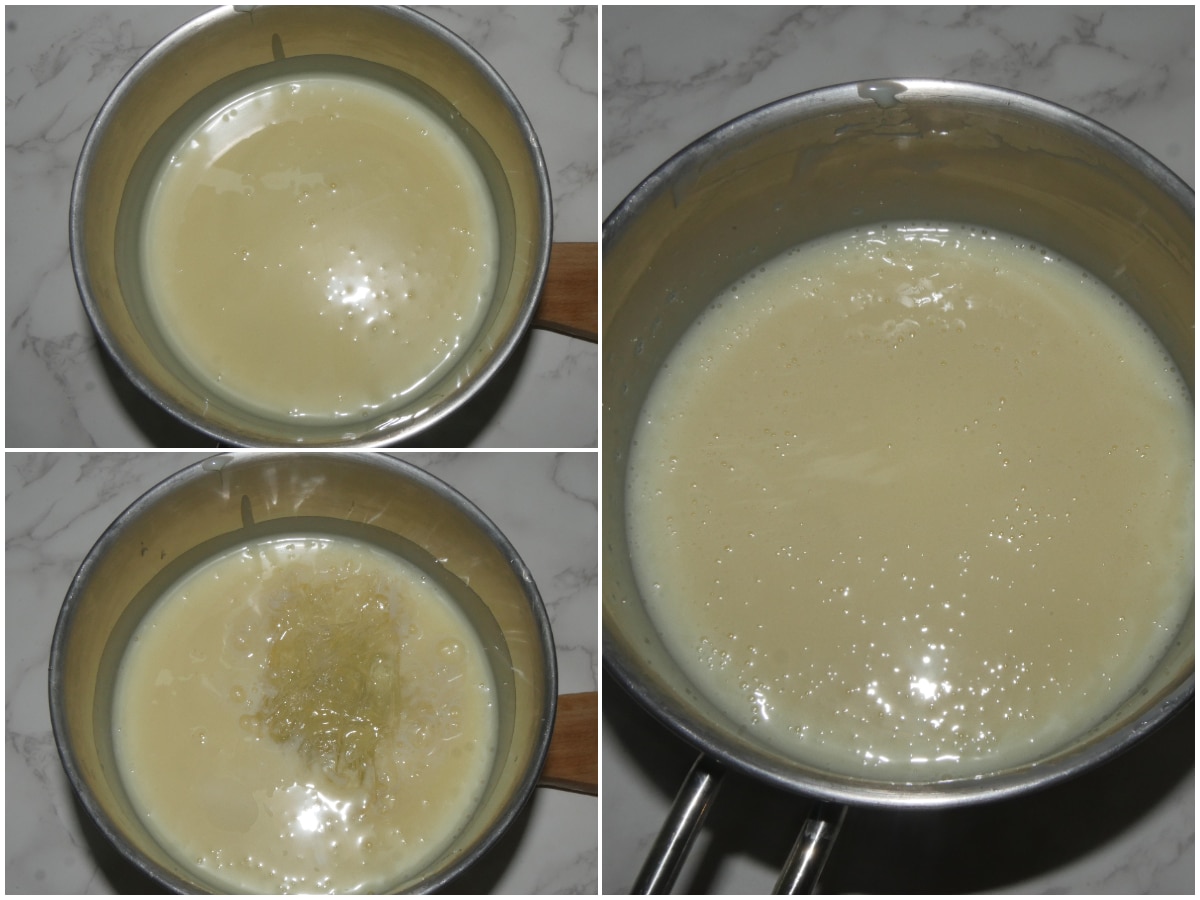 Fate scaldare il latte condensato in un pentolino, quindi toglietelo dal fuoco e aggiungete la colla di pesce dopo averla strizzata delicatamente, mescolando subito per farla sciogliere, poi lasciate intiepidire.