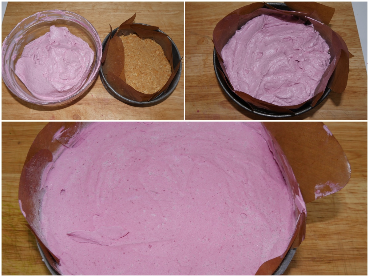 Riprendete lo stampo dal frigo, versate la crema sulla base di biscotti e livellate bene la superficie.