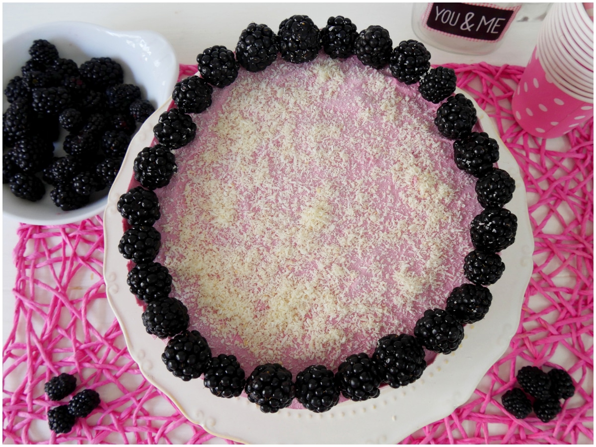 La cheesecake alle more è un dolce fresco e dal gusto leggero, assolutamente perfetto per quando fa caldo (anche se, lo sapete, io sono una patita delle cheesecake e le mangio anche in inverno). Il procedimento è piuttosto classico (proprio come la maggior parte delle cheesecake senza cottura), l'unica variazione sul tema è l'aggiunta delle more cotte alla crema al formaggio, che diventerà così di un bel rosino un po' lilloso, molto misyano, abbastanza scenografico. A quel punto farina di cocco e corona di more saranno solo la proverbiale ciliegina sulla torta di un dolce già fantastico di suo ;)