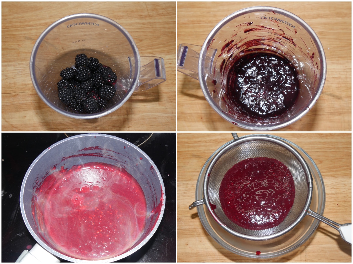 Innanzitutto preparate la salsa alle more: frullatele, mettetele in un pentolino con 2 cucchiai di acqua, portate a ebollizione, quindi filtrate e lasciate raffreddare.
