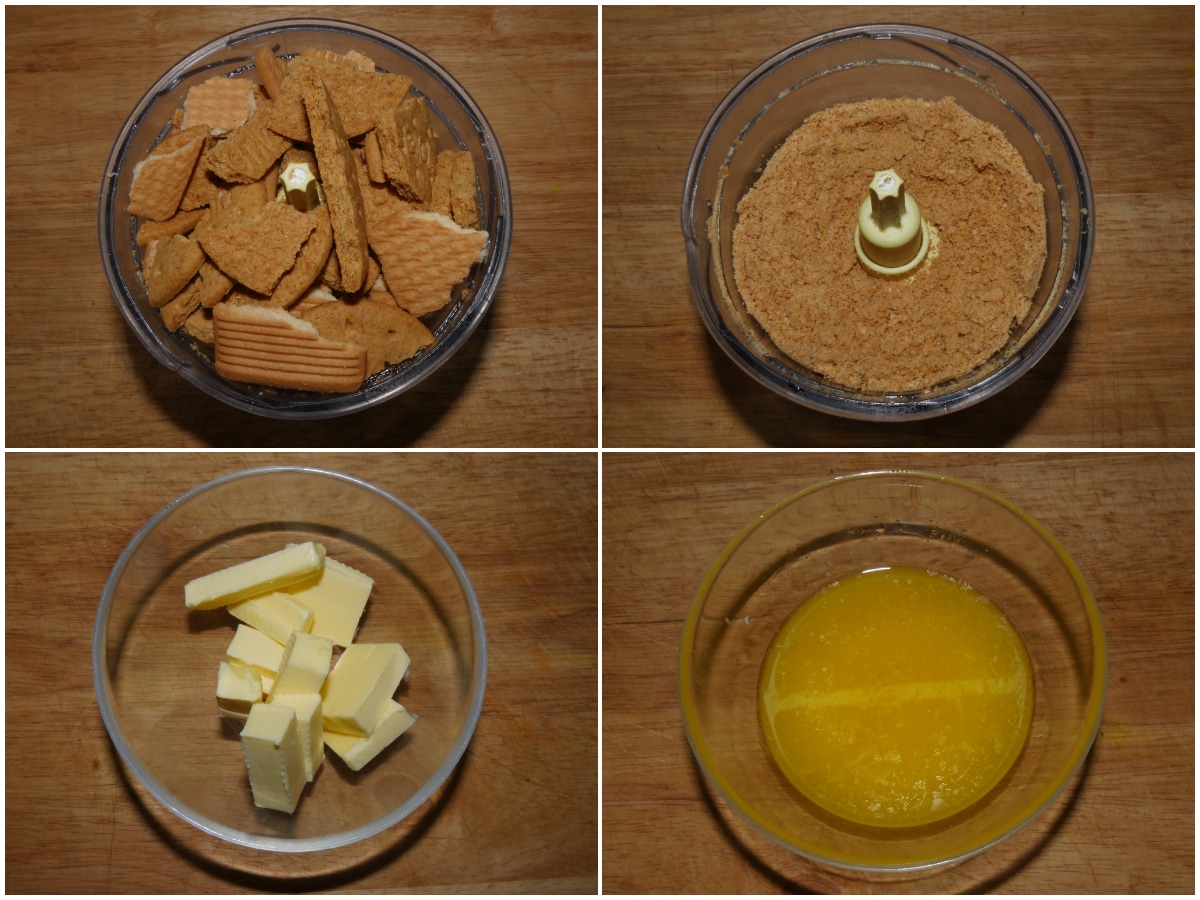 Innanzitutto frllate finemente i biscotti e sciogliete il burro in microonde o a bagnomaria.