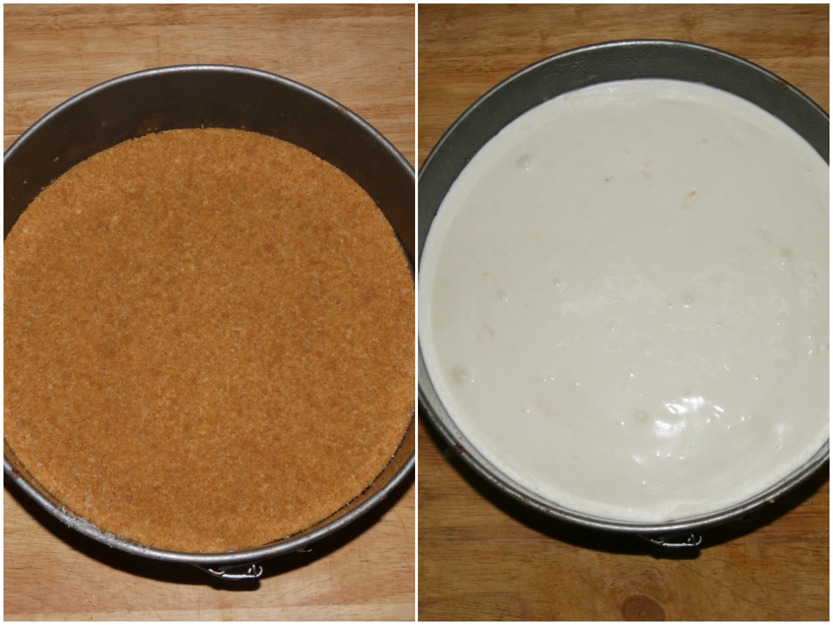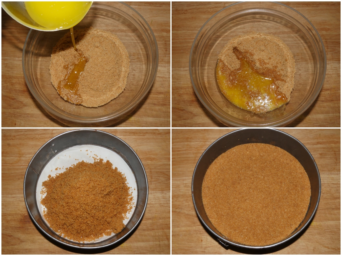 Unite il burro ai biscotti e mescolate, quindi versate il composto nello stampo (coprite il fondo con carta forno), qindi compattate bene con le mani o con il dorso di un cucchiaio, quindi riponete in frigorifero.