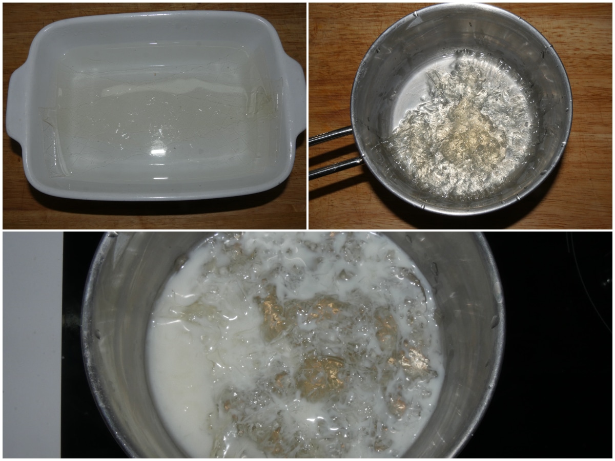 Mettete la colla di pesce in ammollo in acqua fredda per 10 minuti, quindi strizzatela delicatamente e scioglietela in un pentolino con 2 cucchiai di latte.
