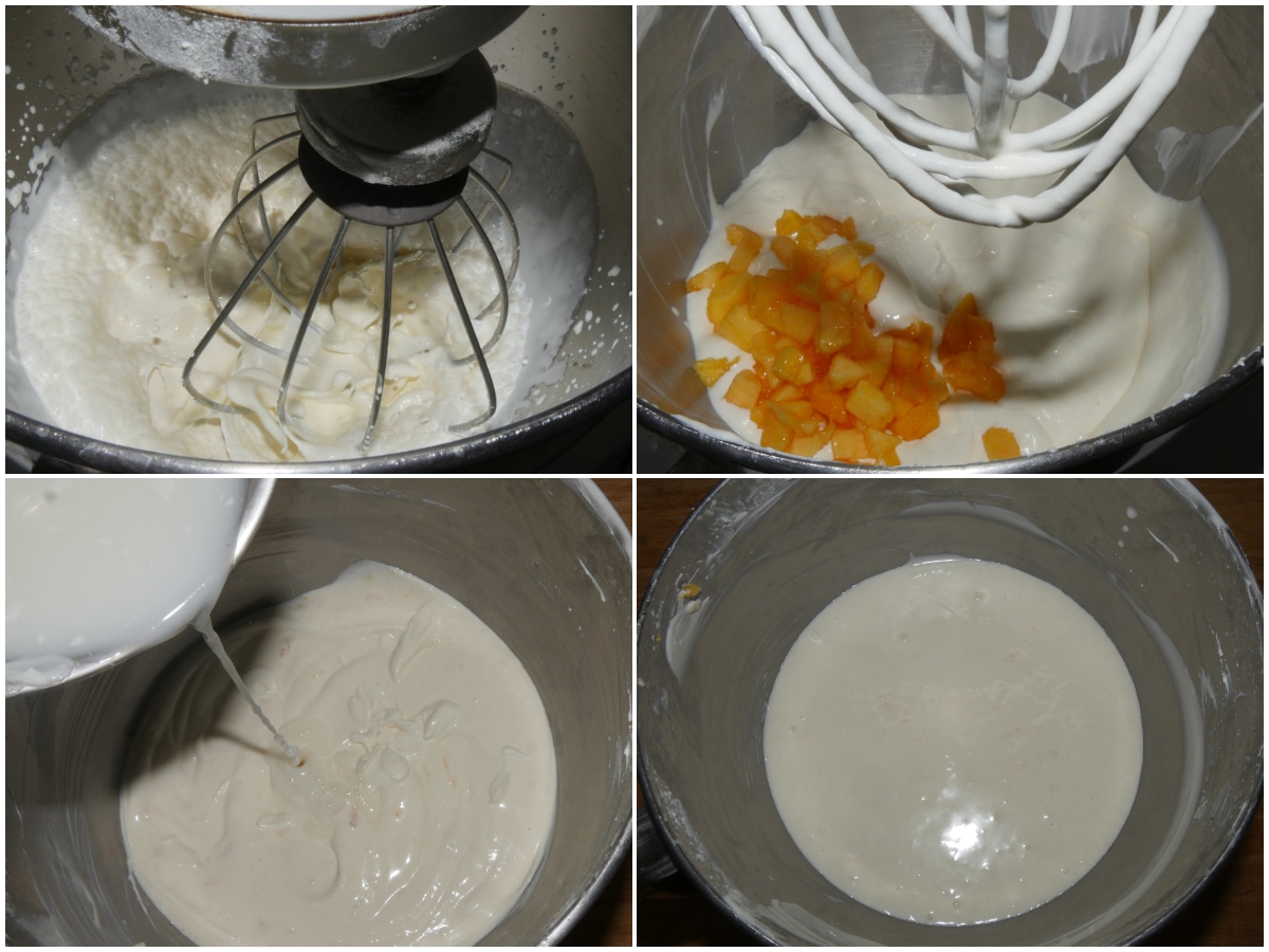 Unite 1/2 pesca tagliata a pezzetti e poi anche lo yogurt, mescolando piano con una spatola. Aggiungete la colla di pesce ben sciolta alla farcia e mescolate bene.