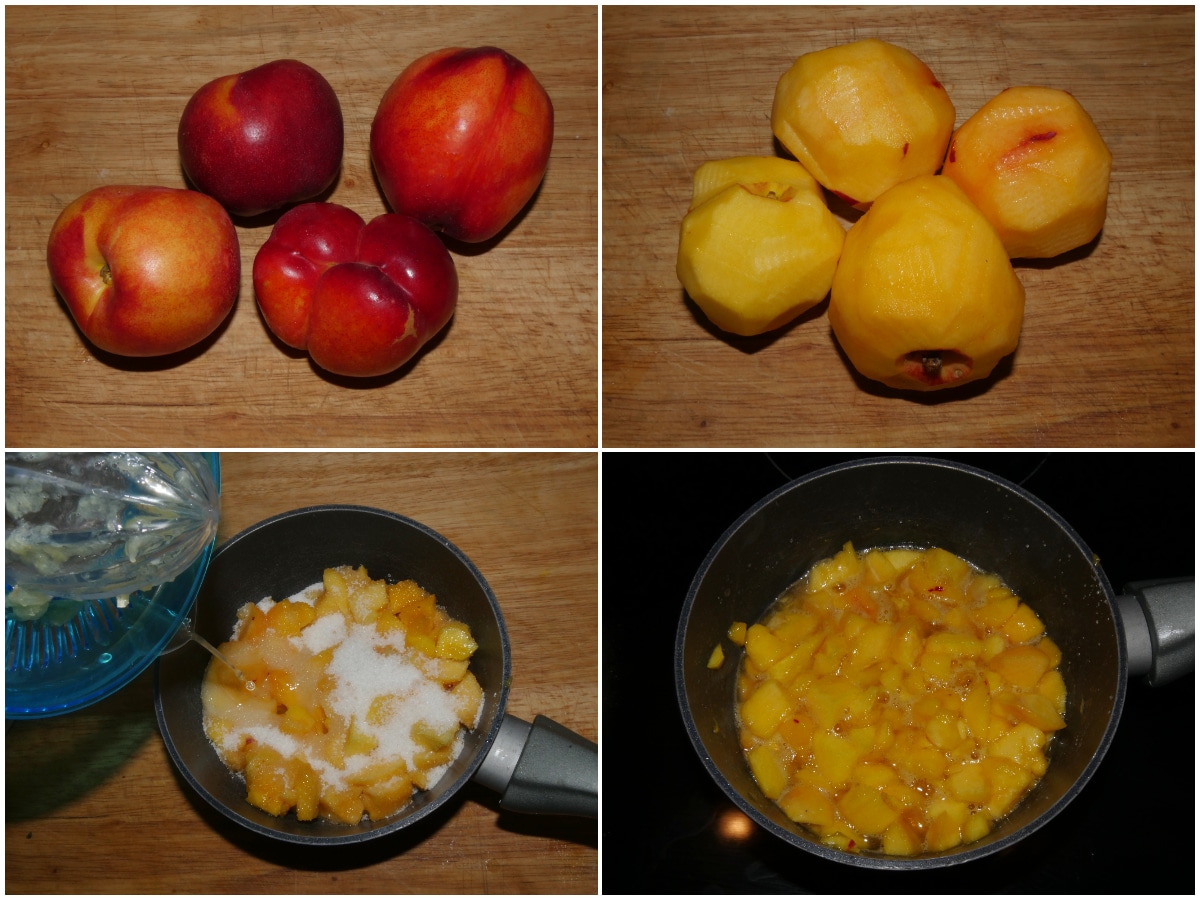 Preparate la coulis di pesche: sbucciatele (le 3 intere e anche la mezza rimasta dalla farcia) e tagliatele a pezzetti, quindi mettetele in un pentolino con zucchero e succo di limone e cuocete per una decina di minuti, finché non si saranno ammorbidite.