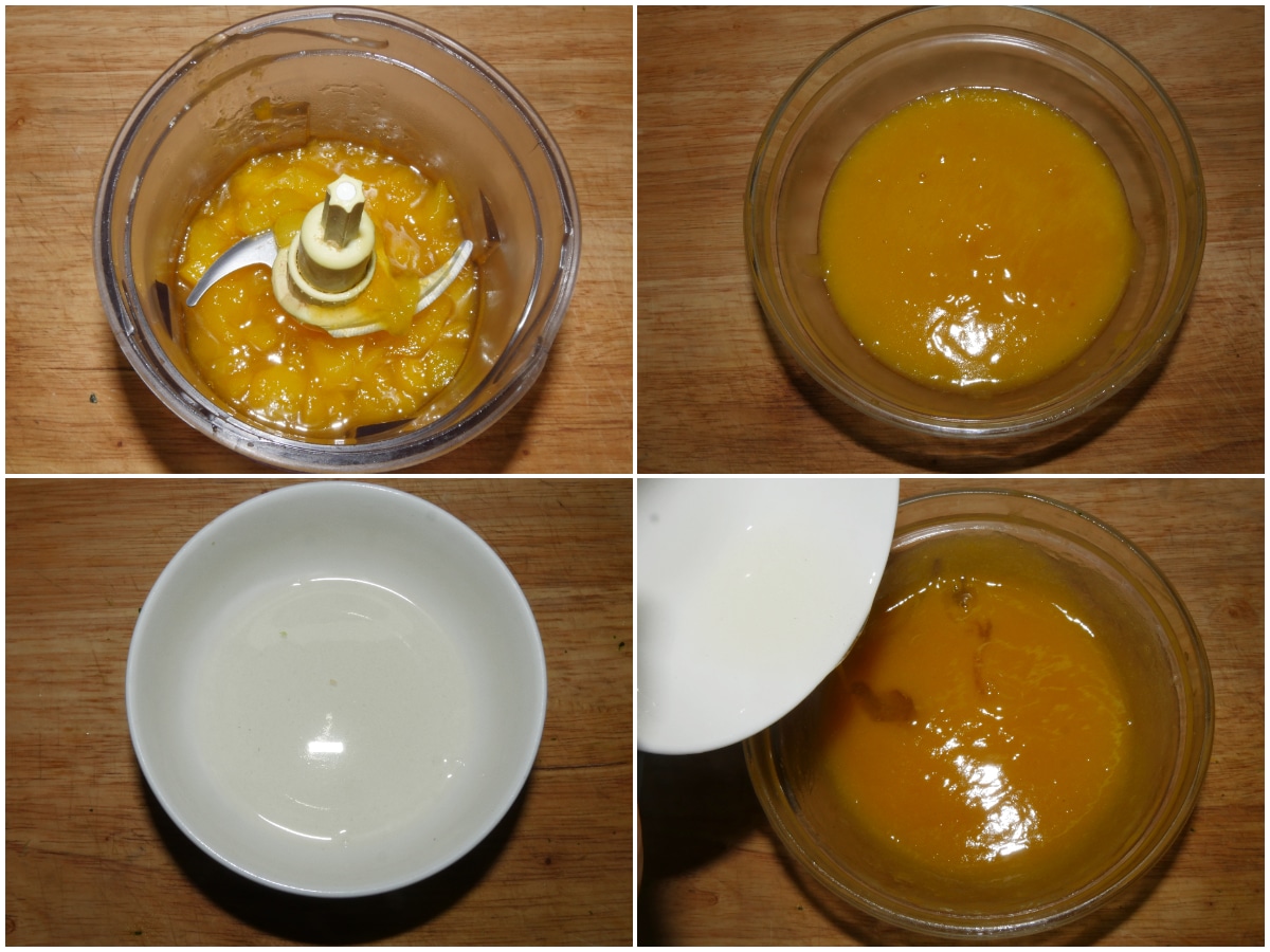 Una volta cotte, frullate le pesche con un mixer (con tutto il loro fondo di cottura), poi unite la colla di pesce dopo averla strizzata e sciolta con 2 cucchiai di acqua calda.