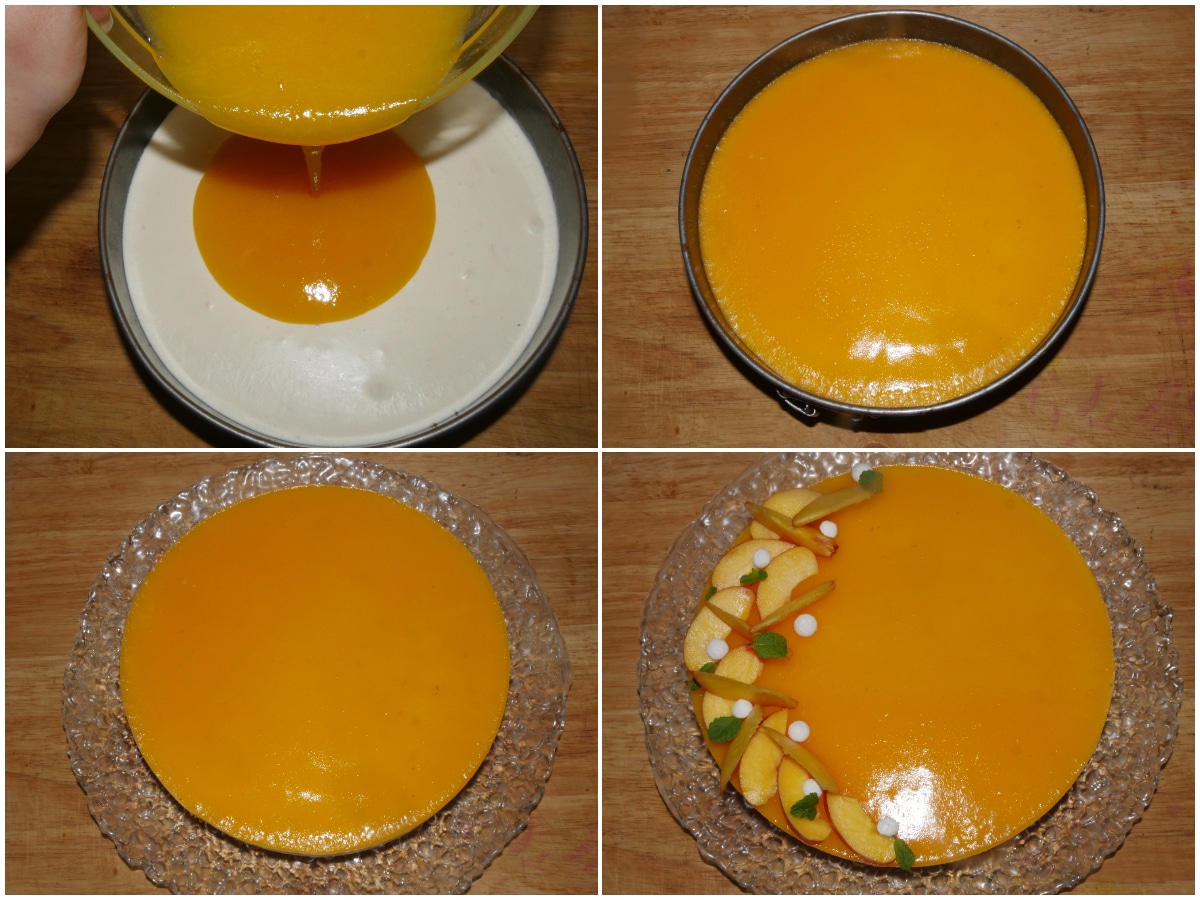 Riprendete la cheesecake, versateci sopra la coulis di pesche cercando di distribuirla in modo uniforme e riponete in frigo per altre 6/8 ore.