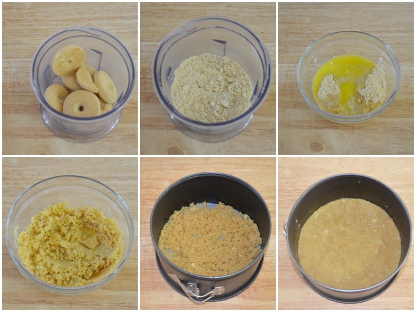 Tritate i biscotti secchi con il mixer e sciogliete il burro al microonde (o a bagnomaria), quindi unite il tutto in una ciotola e mescolate bene.