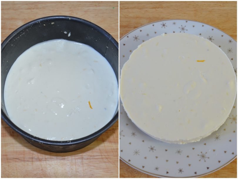 Versate il composto sulla base di biscotti, coprite lo stampo con della pellicola trasparente (senza che tocchi la crema) e lasciate riposare in frigorifero per almeno 5 ore e comunque fino al momento di servire.