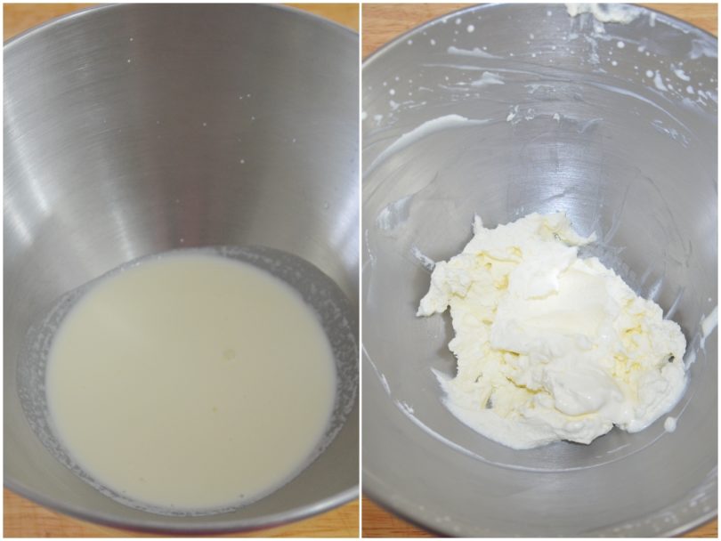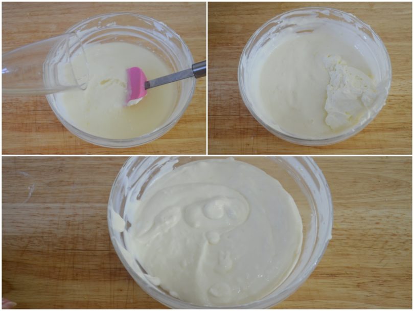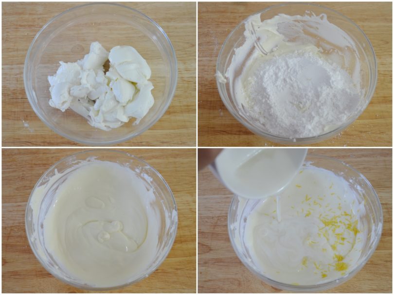Lavorate in un'ampia ciotola philadelphia e ricotta, quindi aggiungete anche lo zucchero a velo e amalgamate fino ad ottenere una crema ben liscia.