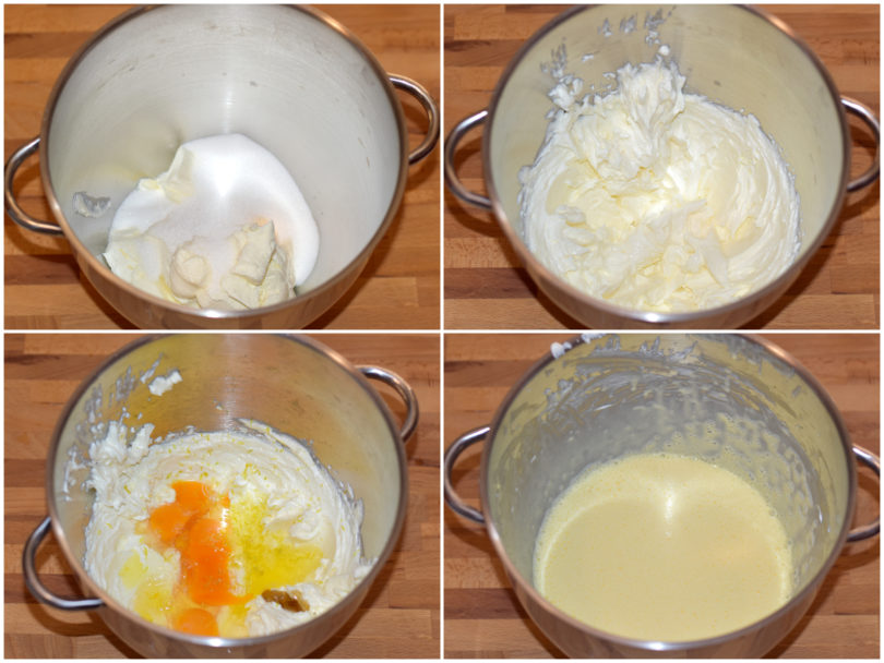 Innanzitutto montate il formaggio con lo zucchero, usando le fruste, quindi incorporate uova, vaniglia e limone e continuate a montare.