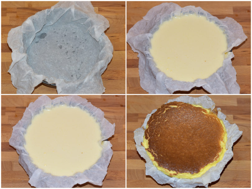 Versate l'impasto così ottenuto nello stampo rivestito di carta forno (tagliatela in modo che sia abbondante e sporga oltre i bordi dello stampo, bagnatela sotto acqua corrente, strizzatela e poi disponetela nello stampo).