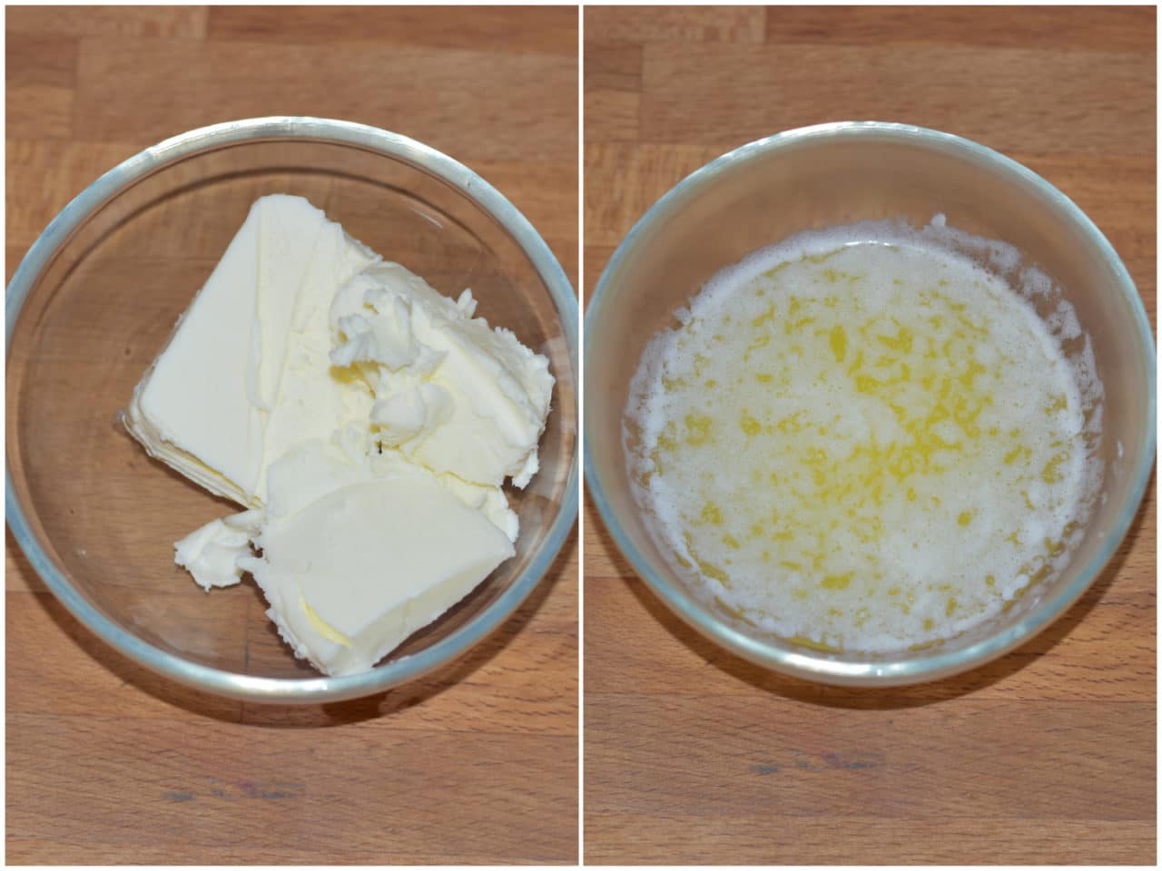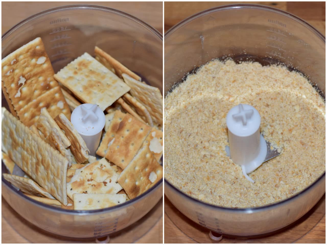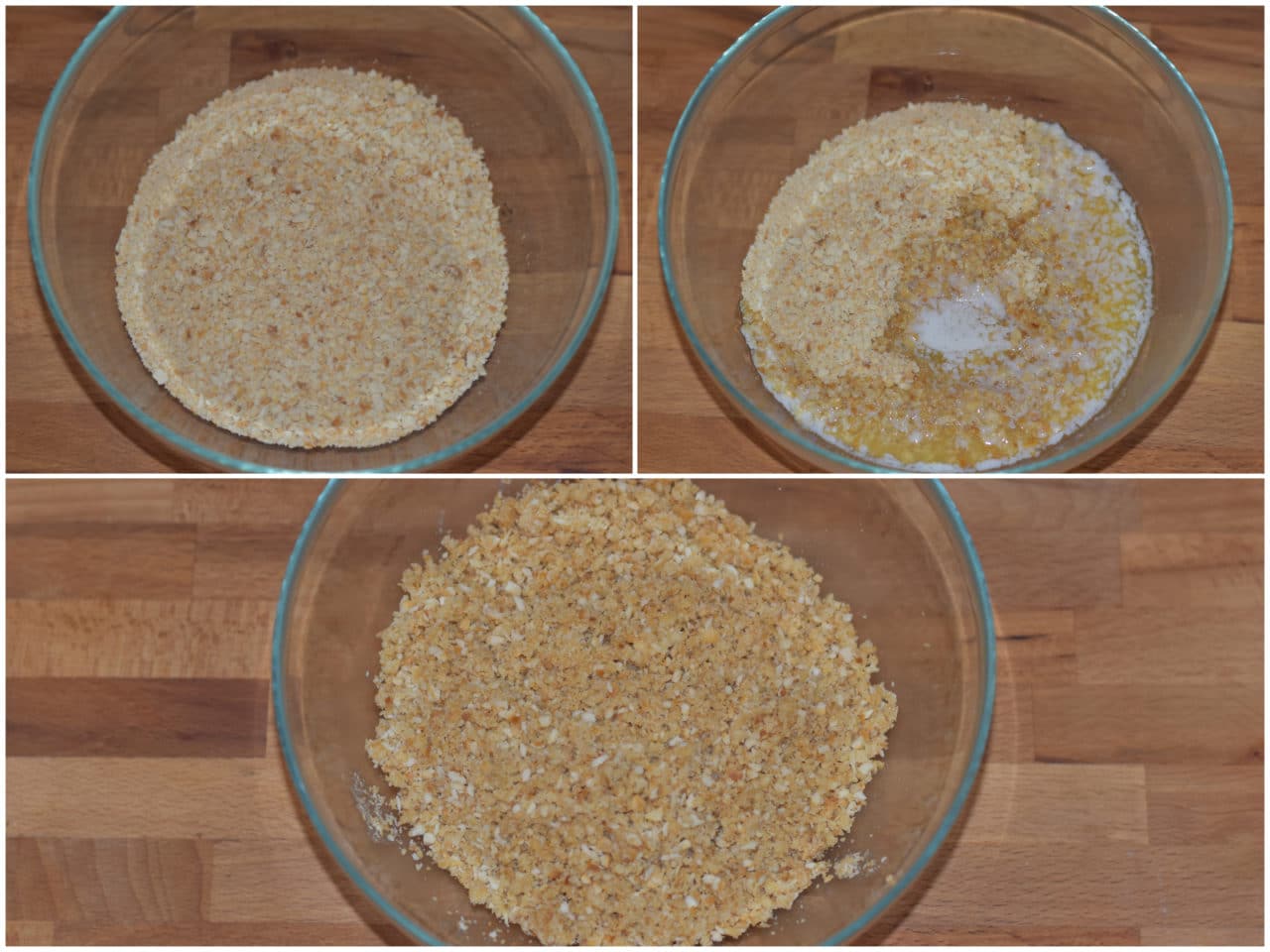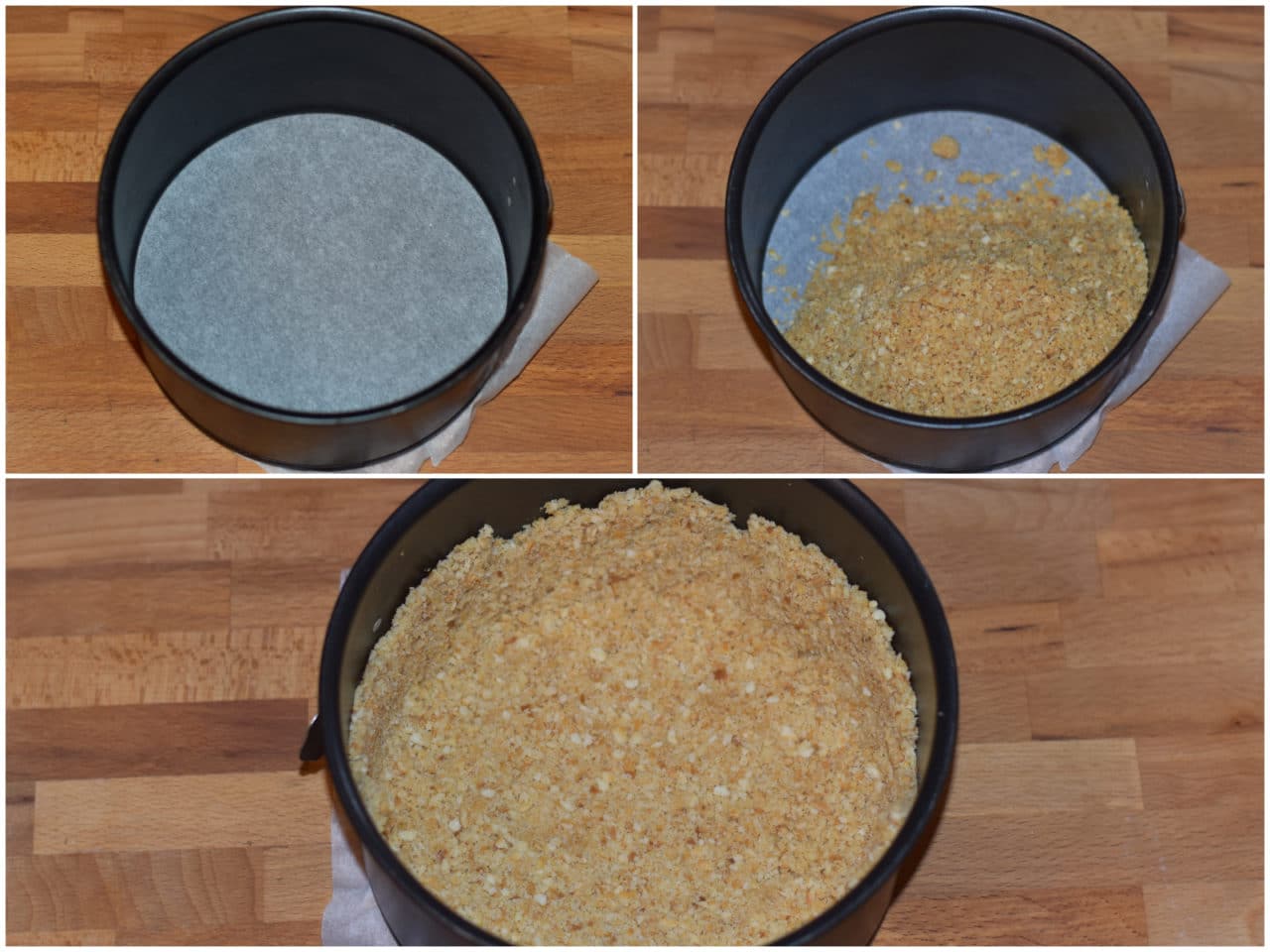 Innanzitutto frullate abbastanza finemente i crackers, quindi uniteli al burro precedentemente fuso (a bagnomaria o in microonde), mescolando bene.