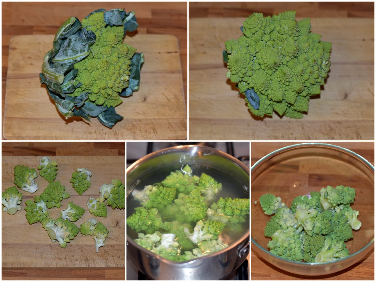 Intanto mondate il cavolo romano, dividetelo in cimette e sbollentatelo per 10-12 minuti in acqua bollente leggermente salata, poi scolate e lasciate raffreddare.