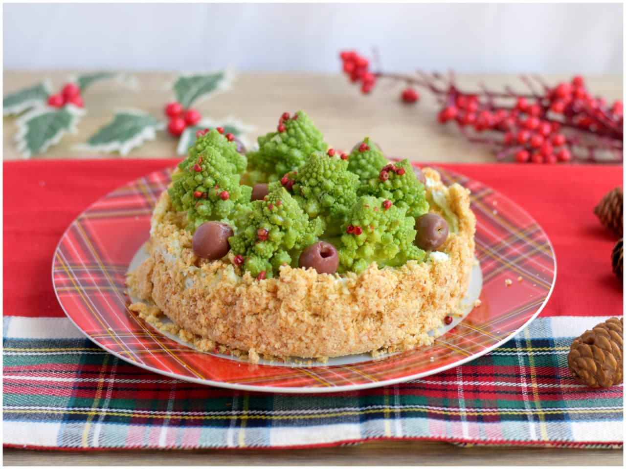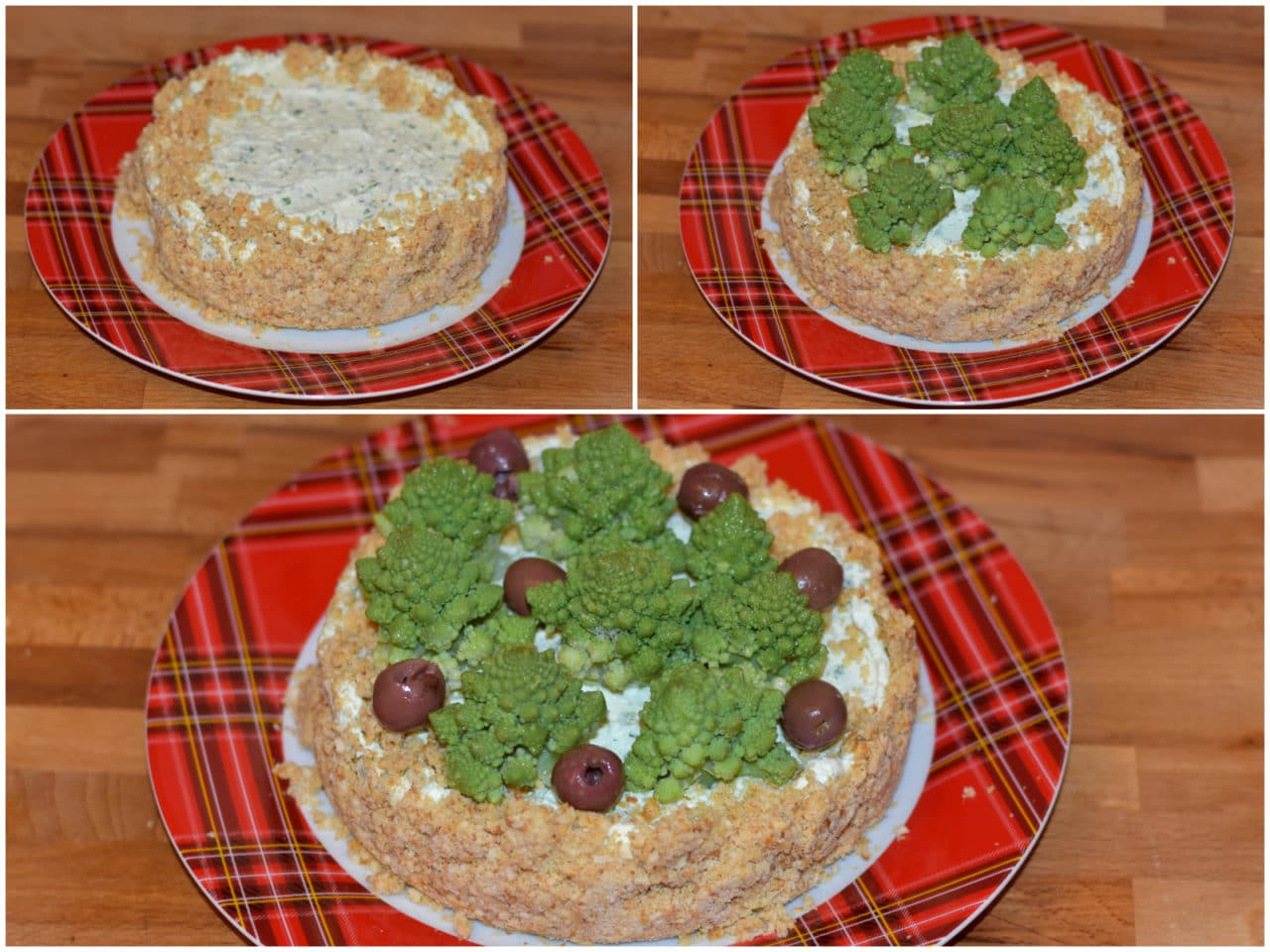 Riprendete la cheesecake, toglietela delicatamente dallo stampo per passarla su di un piatto da portata e disponeteci sopra i vostri alberelli di cavolfiore, accompagnati dalle olive.