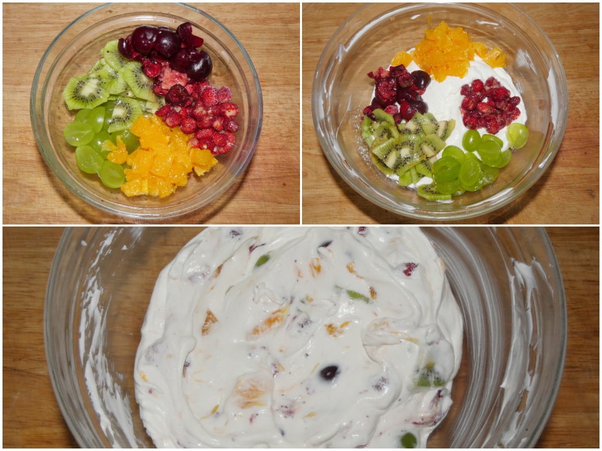 Lasciate riposare in frigo e nel frattempo preparate la frutta: lavatela, mondatela e tagliatela a pezzetti (naturalmente i frutti di bosco vanno lasciati interi, togliendo solo il picciolo).