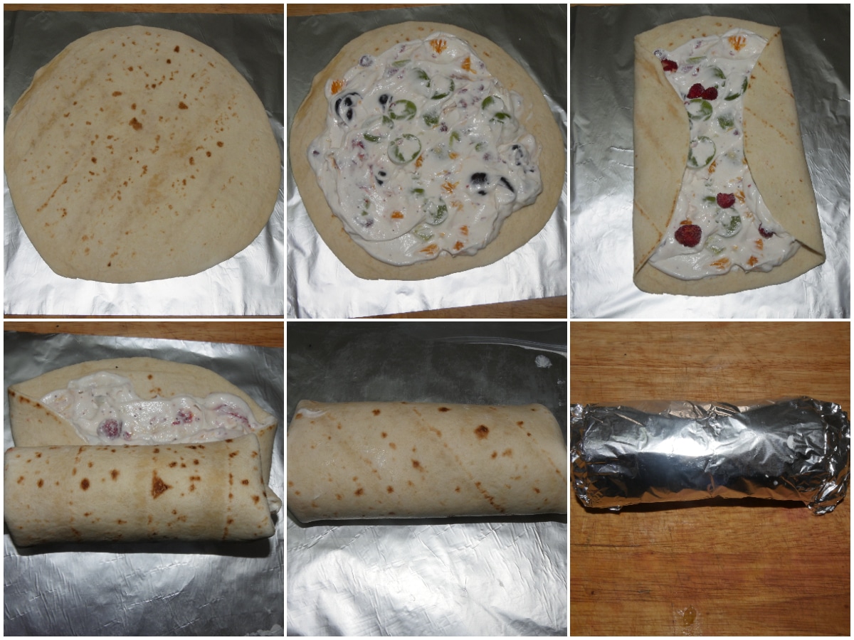 Chiudete quindi ogni tortilla come se fosse un burrito: ripiegate 2 bordi paralleli sulla farcitura, quindi arrotolate la tortilla partendo da uno dei bordi rimasti; una volta ottenuto un burrito chiudetelo bene con l'alluminio e riponete in frigo per 30 minuti.