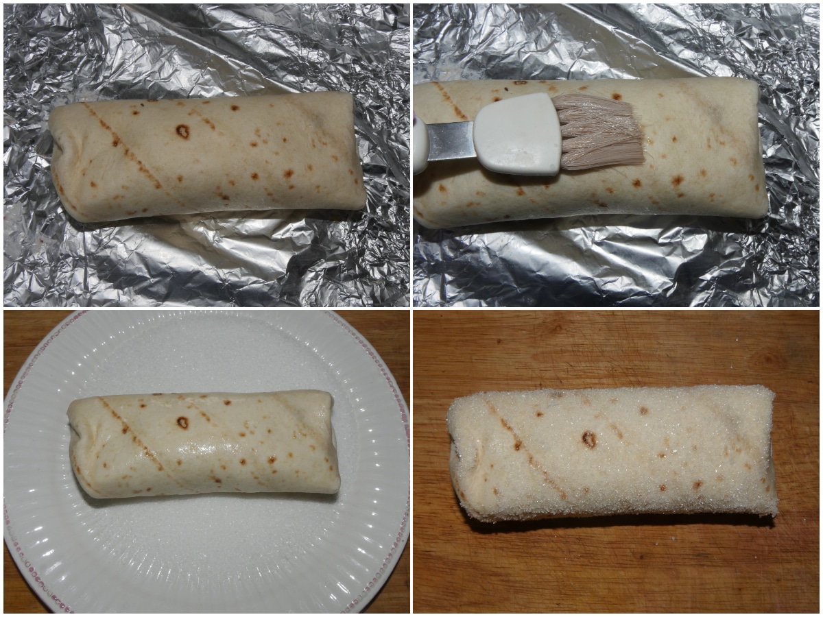Riprendete i burritos, spennellateli con burro sciolto (o con acqua) e passateli nello zucchero.