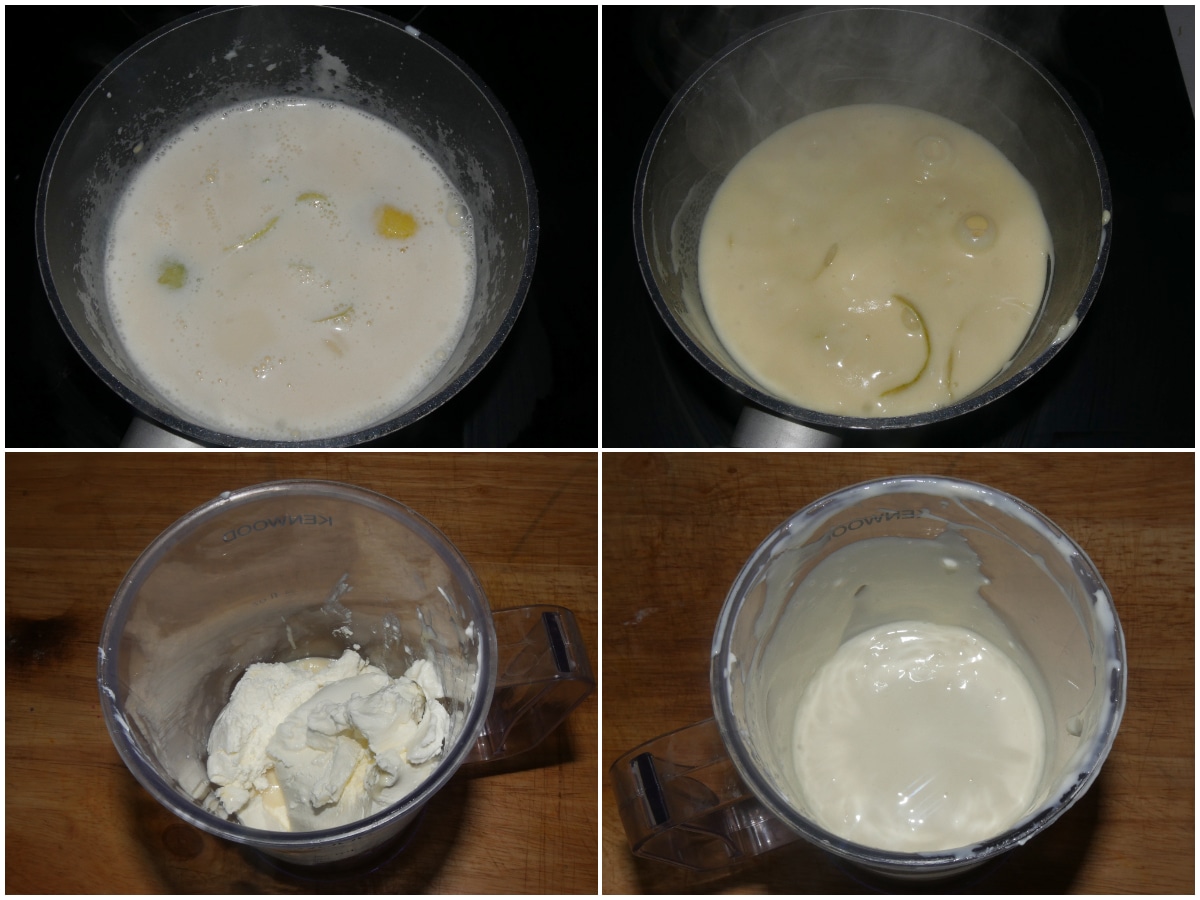 A questo punto eliminate la buccia di limone, fate almeno intiepidire e incorporate il mascarpone: io per fare prima ed essere sicura che il risultato fosse una crema molto liscia ho mischiato usando il minipimer.