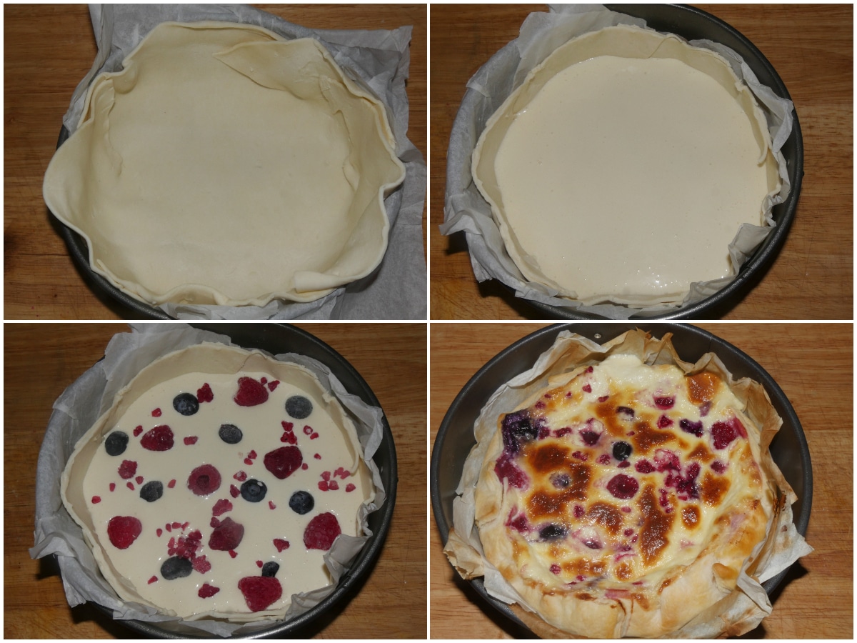 Disponete la sfoglia nello stampo, versateci dentro la crema, livellate la superficie, pareggiate i bordi della sfoglia, decorate con i frutti di bosco e cuocete per circa 20-25 minuti a 200°C, in forno ventilato già caldo.