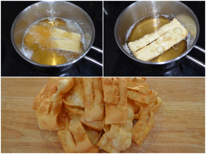 In una padella versare l’olio di semi e quando sarà bollente, friggere le chiacchiere poche per volta.