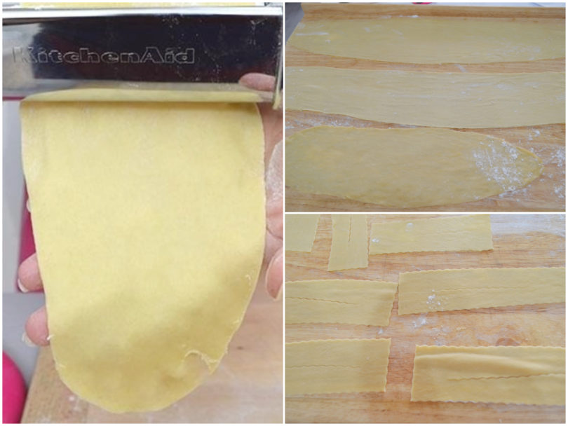 Adagiare man mano le sfoglie su una spianatoia infarinata. Con una rotellina dentata ritagliare tante striscioline lunghe 6 cm e larghe 2 cm (o della misura che volete).