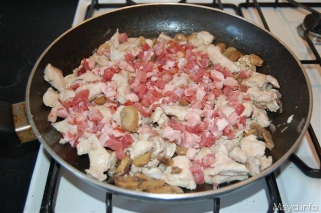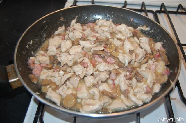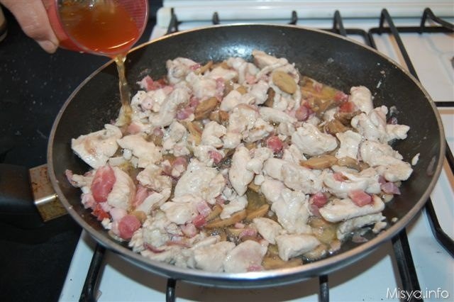 Una volta rosolato il pollo aggiungere i funghi tagliati a fettine sottili e la pancetta tagliata a dadini