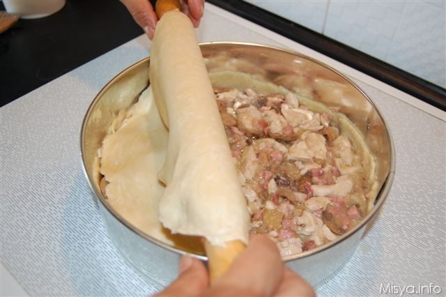 Versare il ripieno al pollo sulla base e ricoprire con un altro strato di pasta
