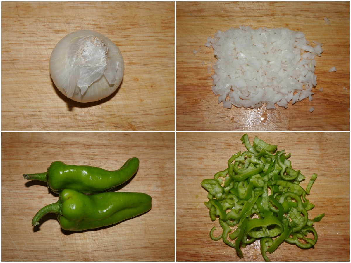 Mondate le verdure, tritate la cipolla e tagliate 2 peperoncini a rondelle (gli altri vi serviranno per decorare i piatti).