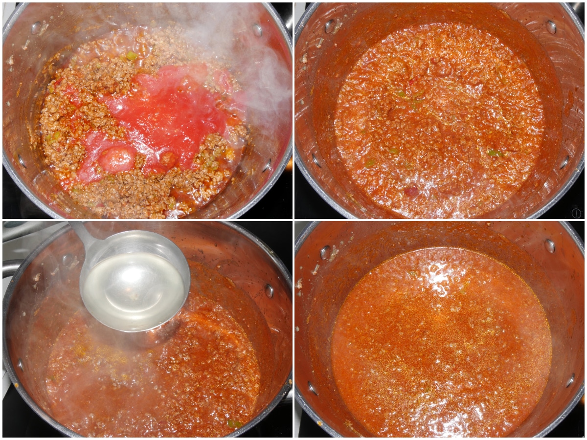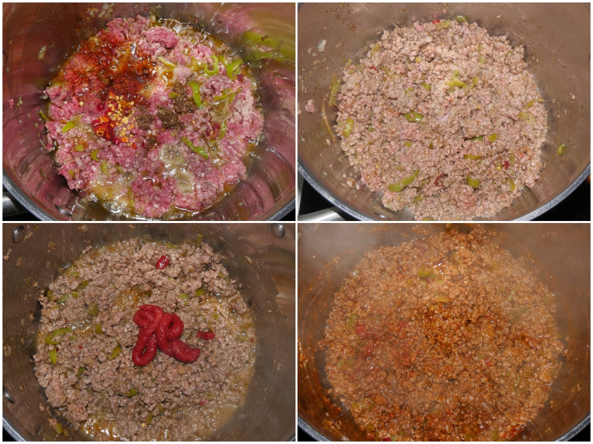 Quando la carne sarà quasi cotta, aggiungete le spezie (cumino, coriandolo, paprica e peperoncino piccante), e quando sarà cotta incorporate anche il concentrato di pomodoro.