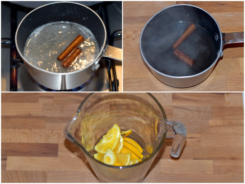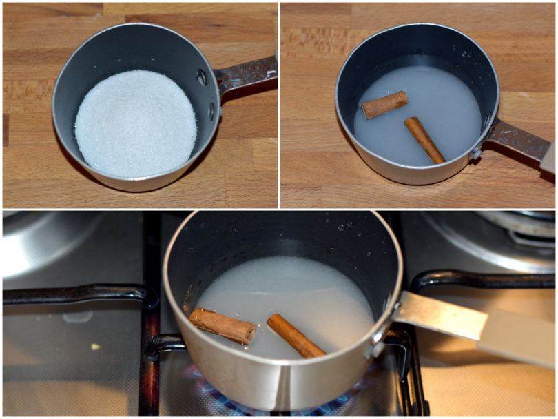 Innanzitutto preparate lo sciroppo: unite zucchero, acqua e cannella in un pentolino, portate a ebollizione, lasciate cuocere ancora per 5 minuti, poi spegnete e lasciate raffreddare.