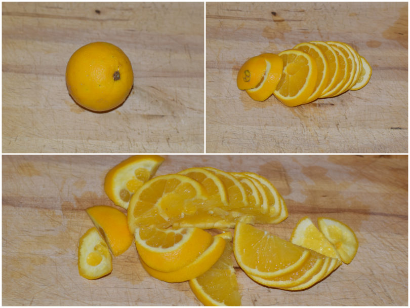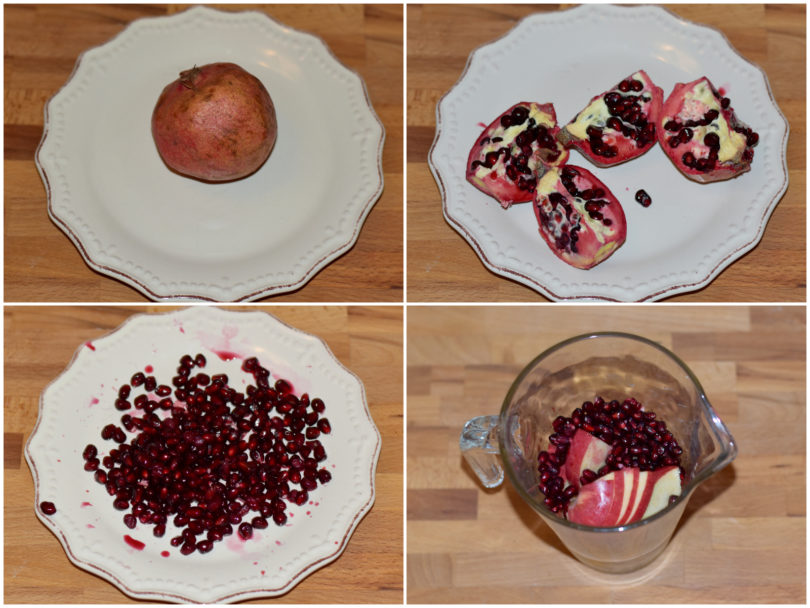 Mondate la frutta: aprite e sgranate la melagrana, lavate e tagliate a fettine e poi di nuovo a metà le mele, eliminando il torsolo, fate lo stesso con le arance, eliminando eventuali semi.