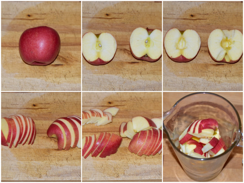 Una volta raffreddato lo sciroppo, eliminate la cannella, quindi iniziate a disporre la frutta in un'ampia caraffa.