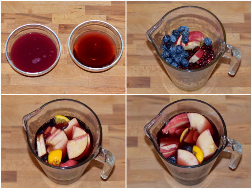 Aggiungete nella caraffa anche tutti i liquidi (succhi, vino, liquore, sciroppo) e mescolate, poi lasciate riposare in frigo per almeno 2-4 ore.