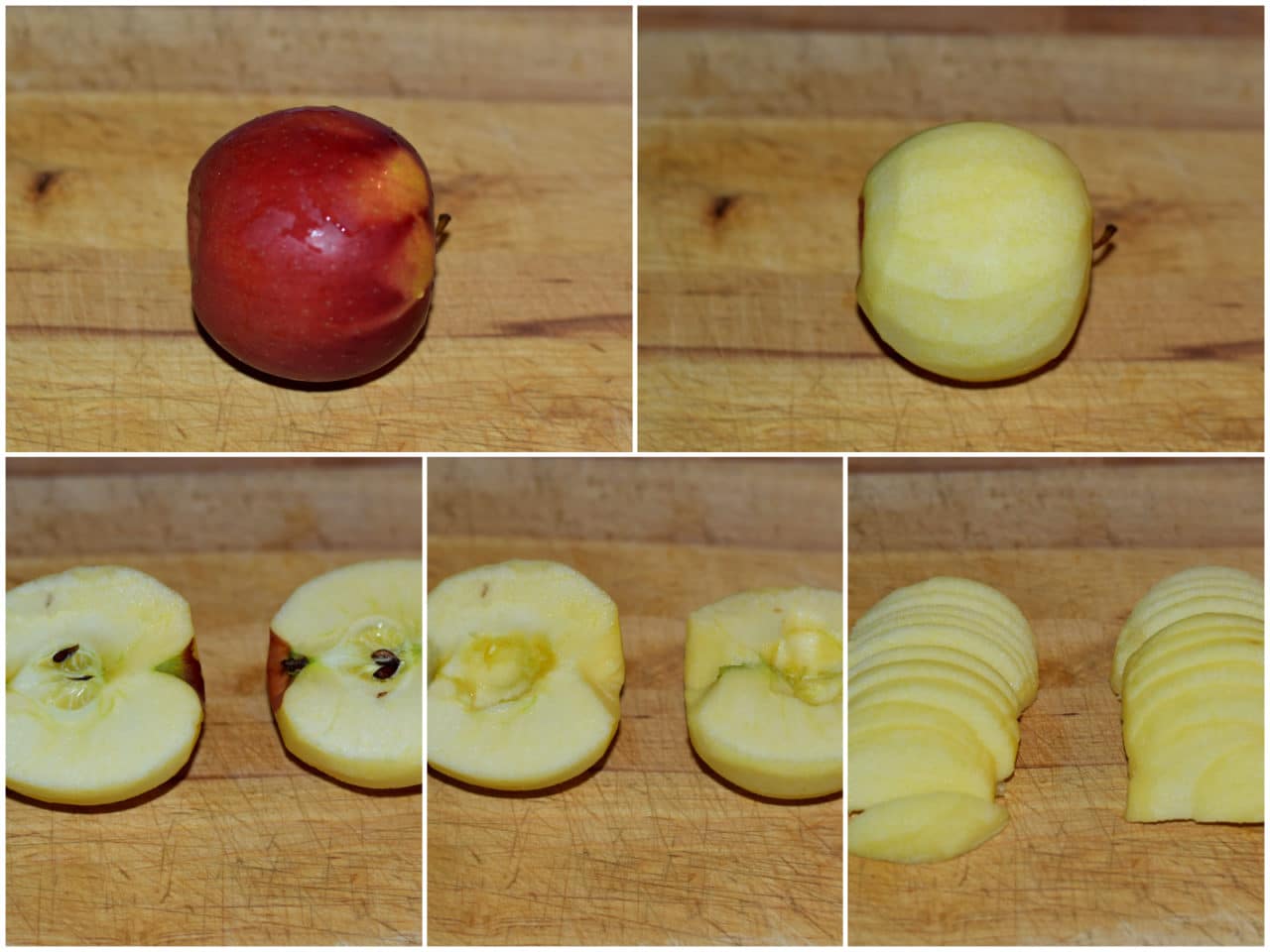 Pelate le mela, lavatele, tagliatele a metà, eliminate il torso centrale e tagliatele a fettine sottili.