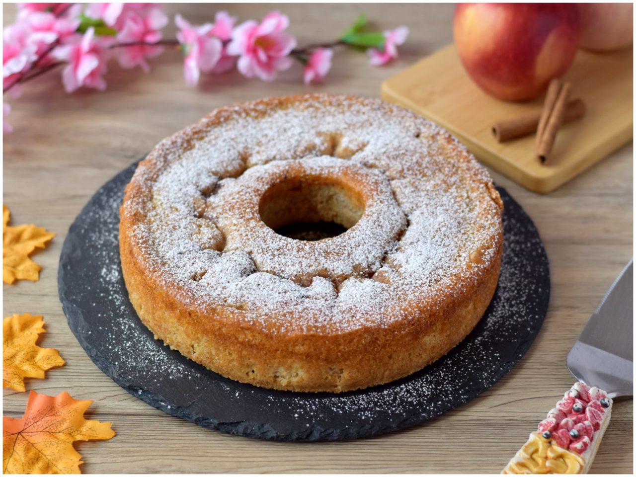 La ciambella alle mele è pronta: lasciatela almeno intiepidire, quindi sformatela, decoratela con zucchero a velo e servite.