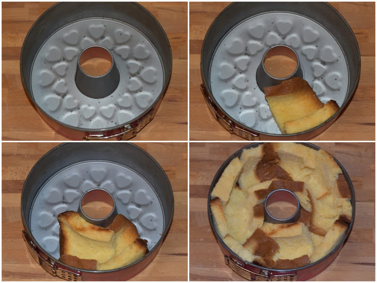 Sovrapponendole leggermente tra di loro, usate le fette di pandoro per foderare lo stampo (se non avete uno stampo a cerniera vi consiglio di foderarlo prima con pellicola per alimenti, in modo che sia più agevole sformare il dolce alla fine).