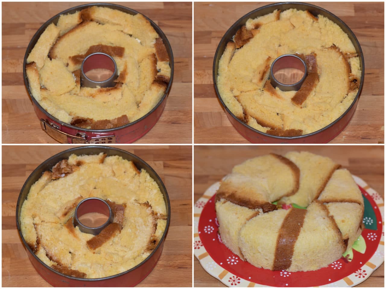 Coprite la farcia con altre fette di pandoro per chiudere la ciambella, bagnate anche queste fette con il latte e lasciate riposare in frigo per almeno 2 ore prima di sformare la ciambella e rovesciarla su di un piatto da portata.
